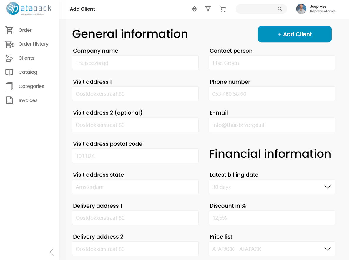 Alle data die getoond wordt in de app komt uit een extern ordersysteem. Door middel van een API wordt deze data opgehaald en wordt data zoals nieuwe klanten of orders geplaatst in het ordersysteem.