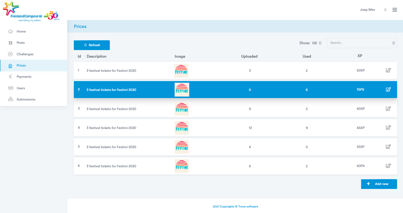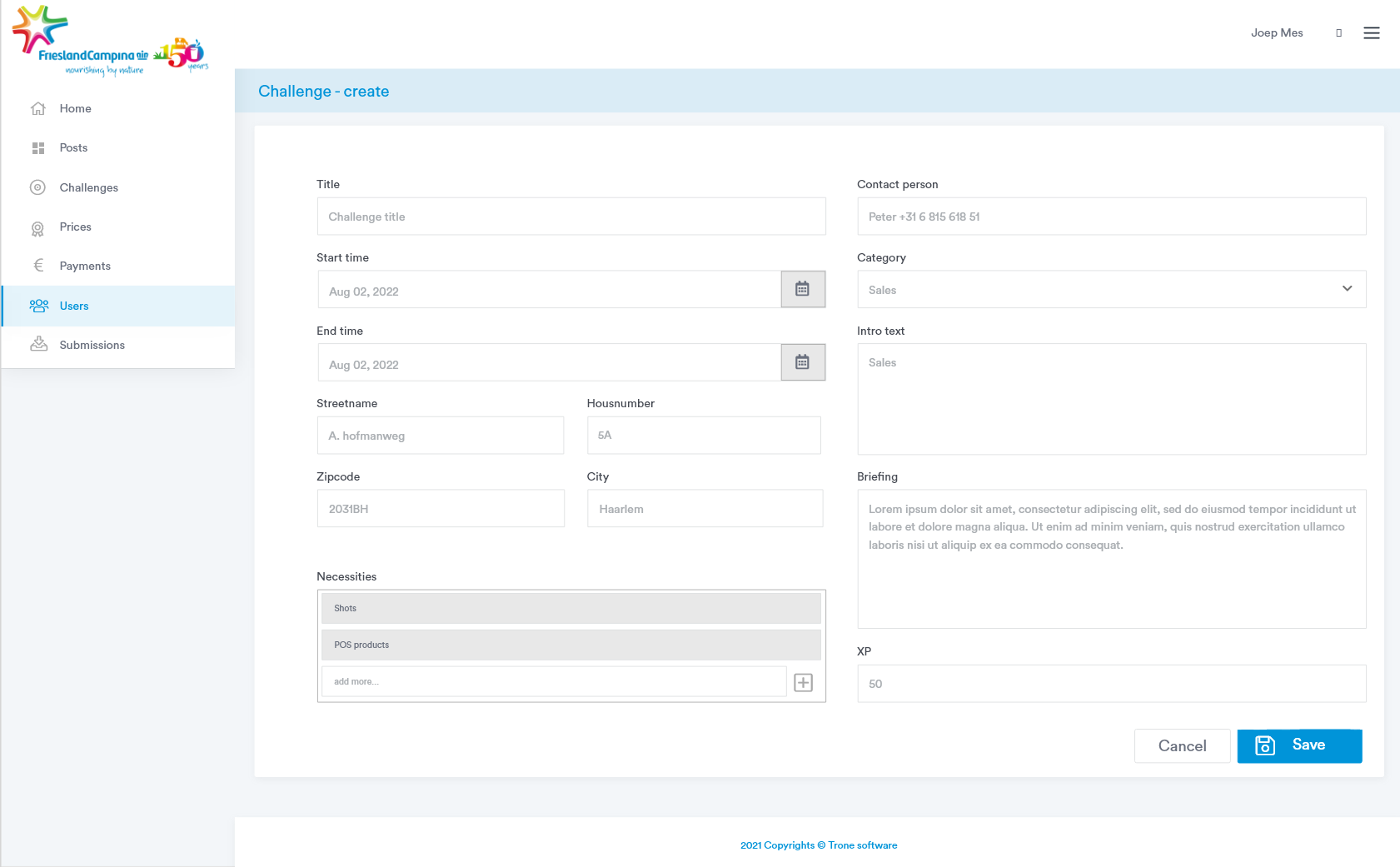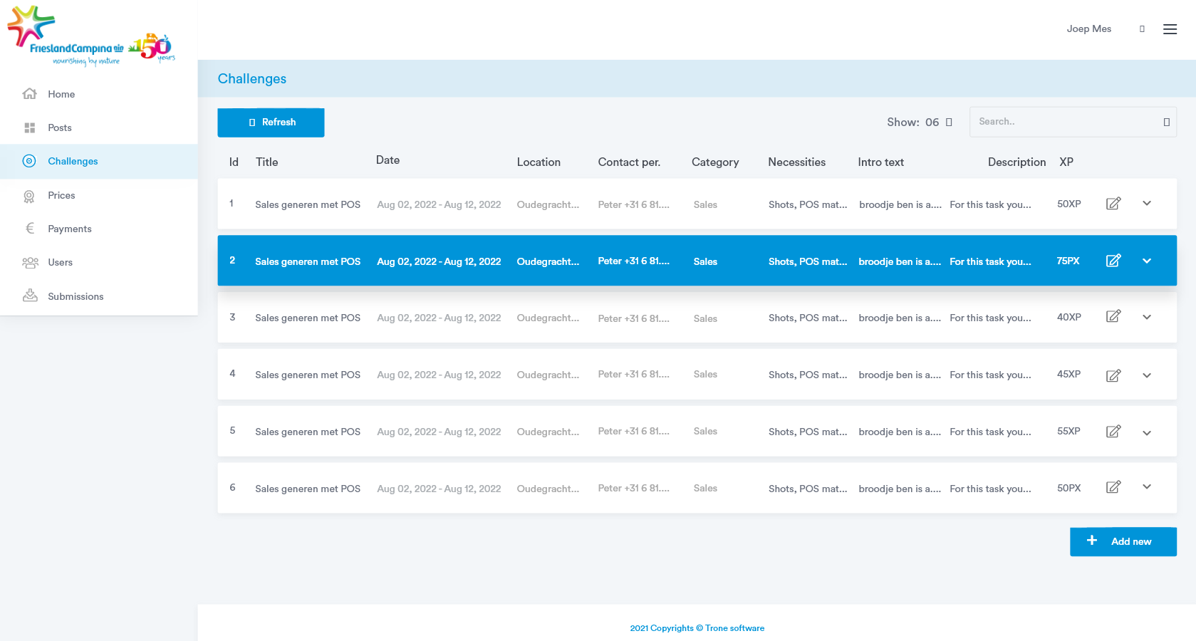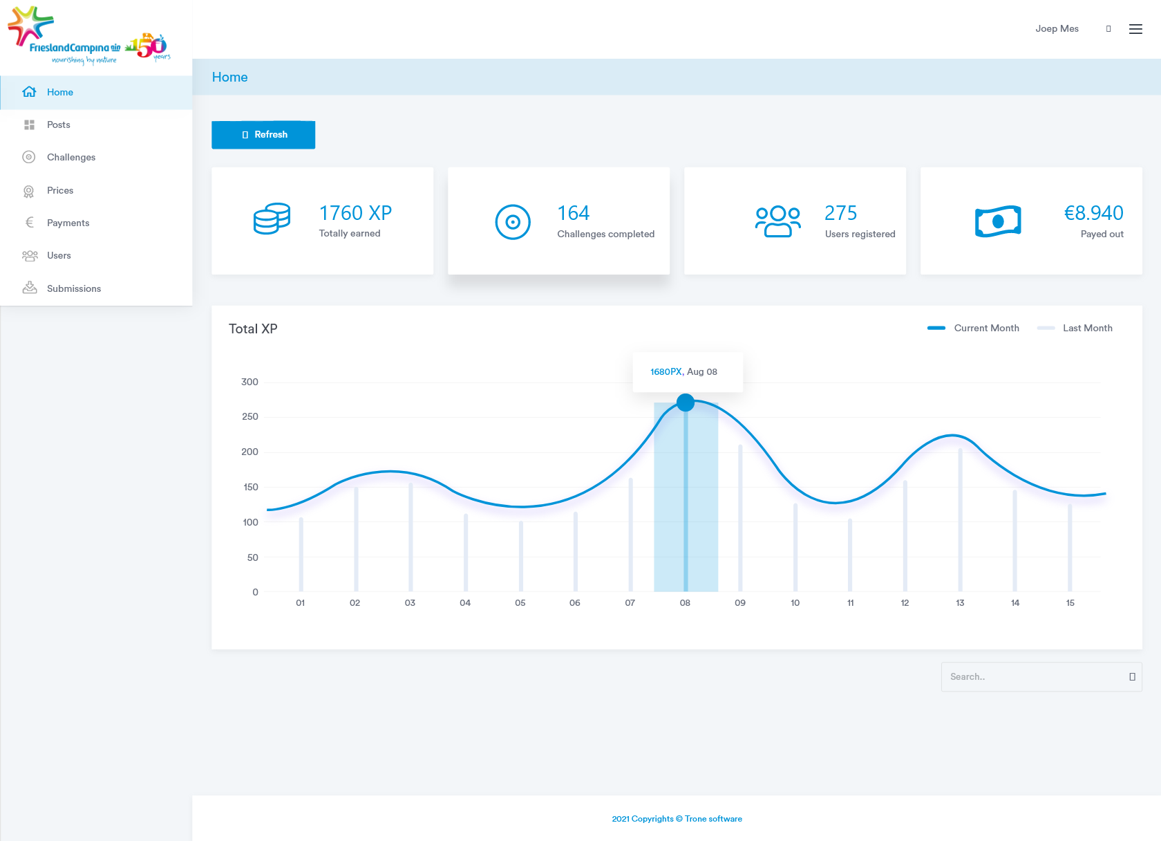 Friesland Campina heeft een groep studenten die producten promoot op verschillende manieren. Dat kan zijn via social media of fysiek in winkels. Trone heeft een portaal en dashboard ontwikkeld waar de studenten opdrachten kunnen zien, rapportages kunnen indienen, beloond worden en uitbetalingen kunnen aanvragen. De studenten worden beloond met XP. Deze kunnen ze zich laten uitbetalen in euro’s op hun rekening, of zij kunnen coupons kopen zoals bioscoop kaarten.Â