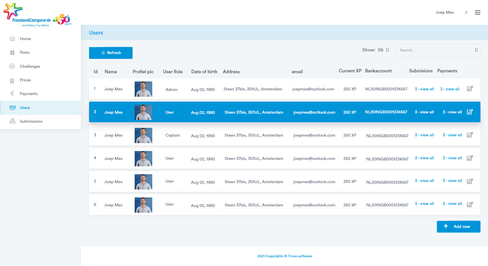 Alle studenten krijgen van Friesland Campina een account. Deze wordt aangemaakt door een admin in het dashboard. Ook worden hier alle gegevens van de studenten beheerd.