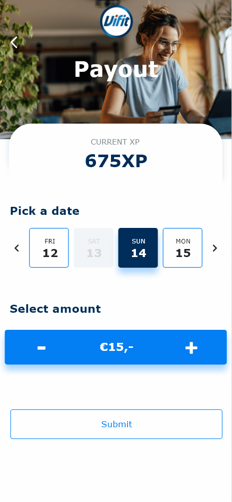 De student heeft de mogelijkheid om de XP die hij heeft verdient met het doen van opdrachten uit te laten betalen in euro's. In dat geval kiest de student een datum waarop hij uitbetaald wil worden en geeft aan hoeveel van zijn XP hij wil laten uitbetalen op zijn bankrekening.