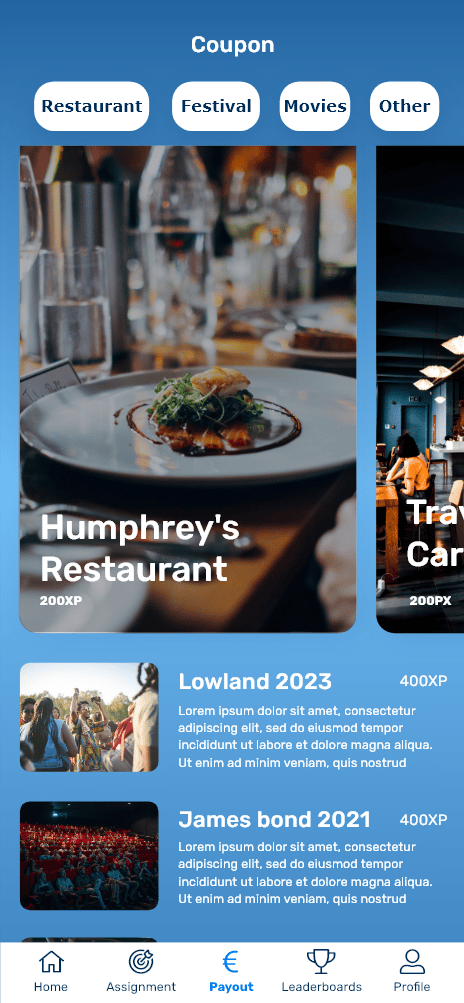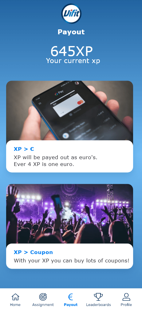 Gebruikers kunnen met hun verdiende XP coupons kopen in de app. Zij kopen dan bijvoorbeeld een bioscoopbon of een ticket voor een festival.