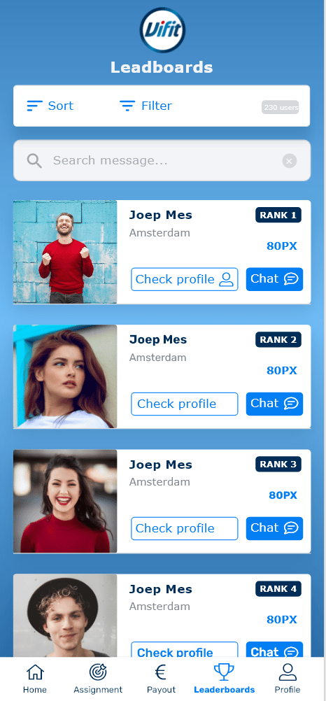 In de leaderboards kan een student zien hoeveel XP hij/zij behaald heeft tot nu toe en hoeveel XP de andere gebruikers in de app hebben.